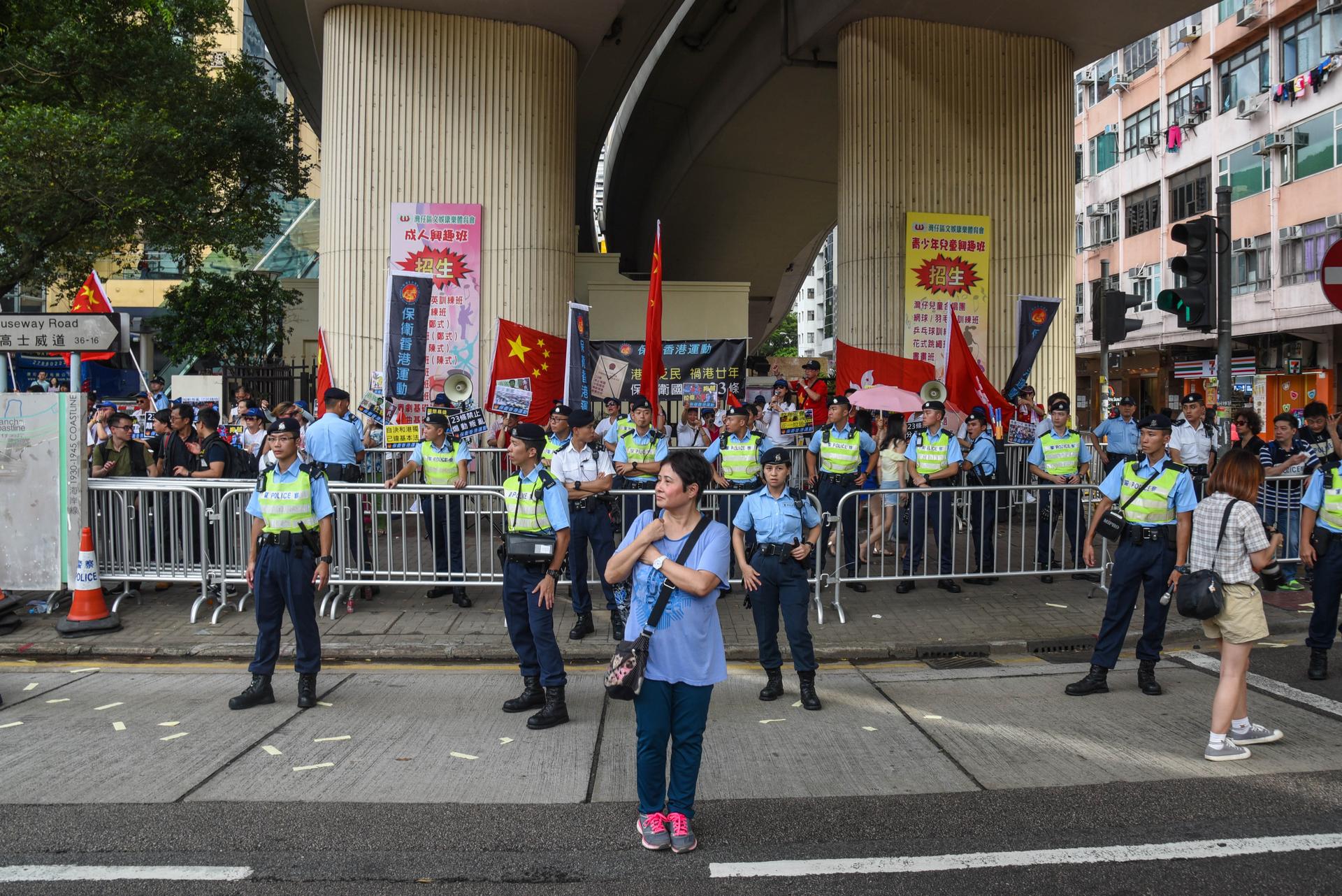Shortly after 3pm, the scheduled setting-off time, protesters gradually began leaving the park in groups, winding their way down Causeway Road as pro-China supporters jeered from cordoned-off areas opposite the Central Library and underneath Moreton Terrace Flyover.