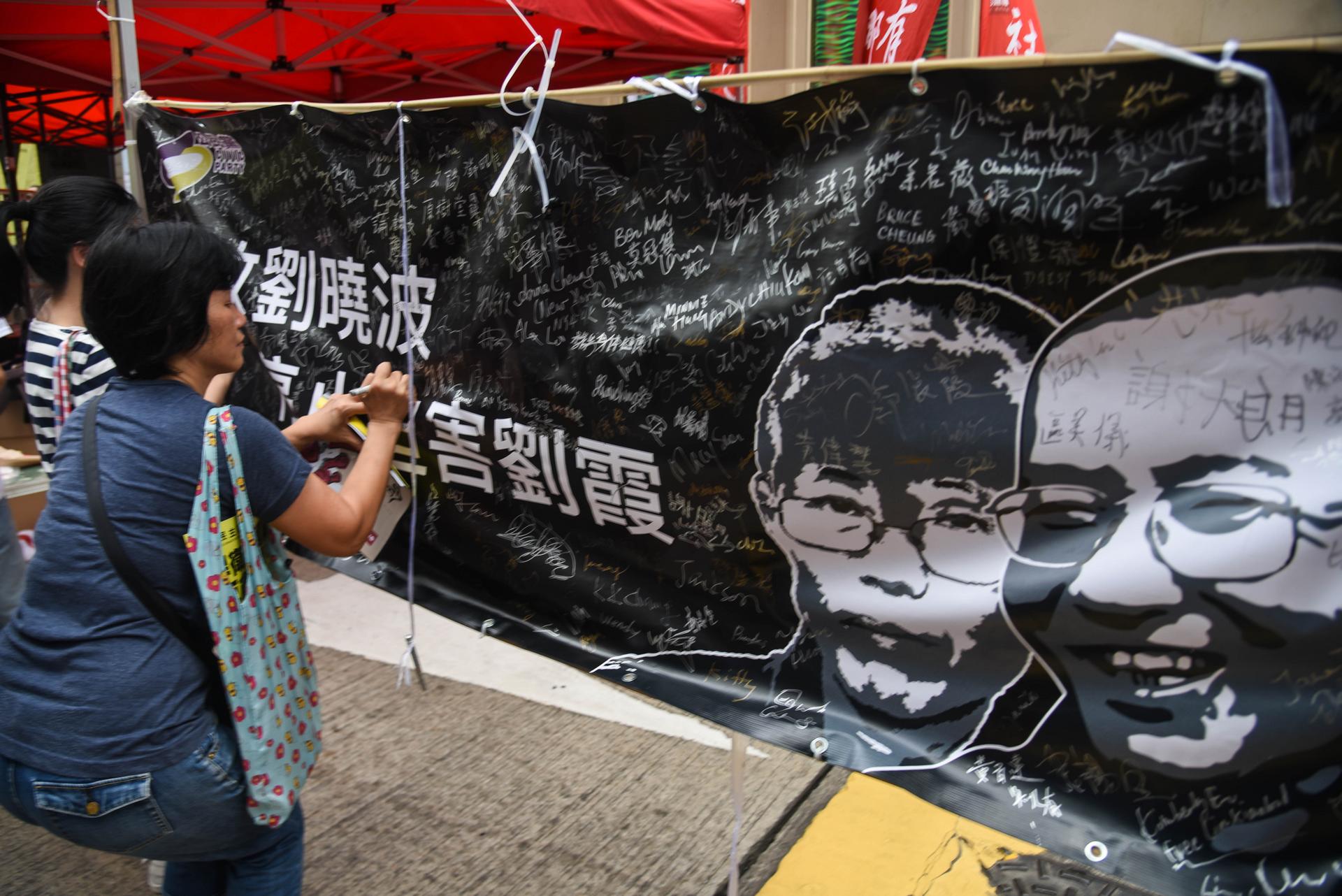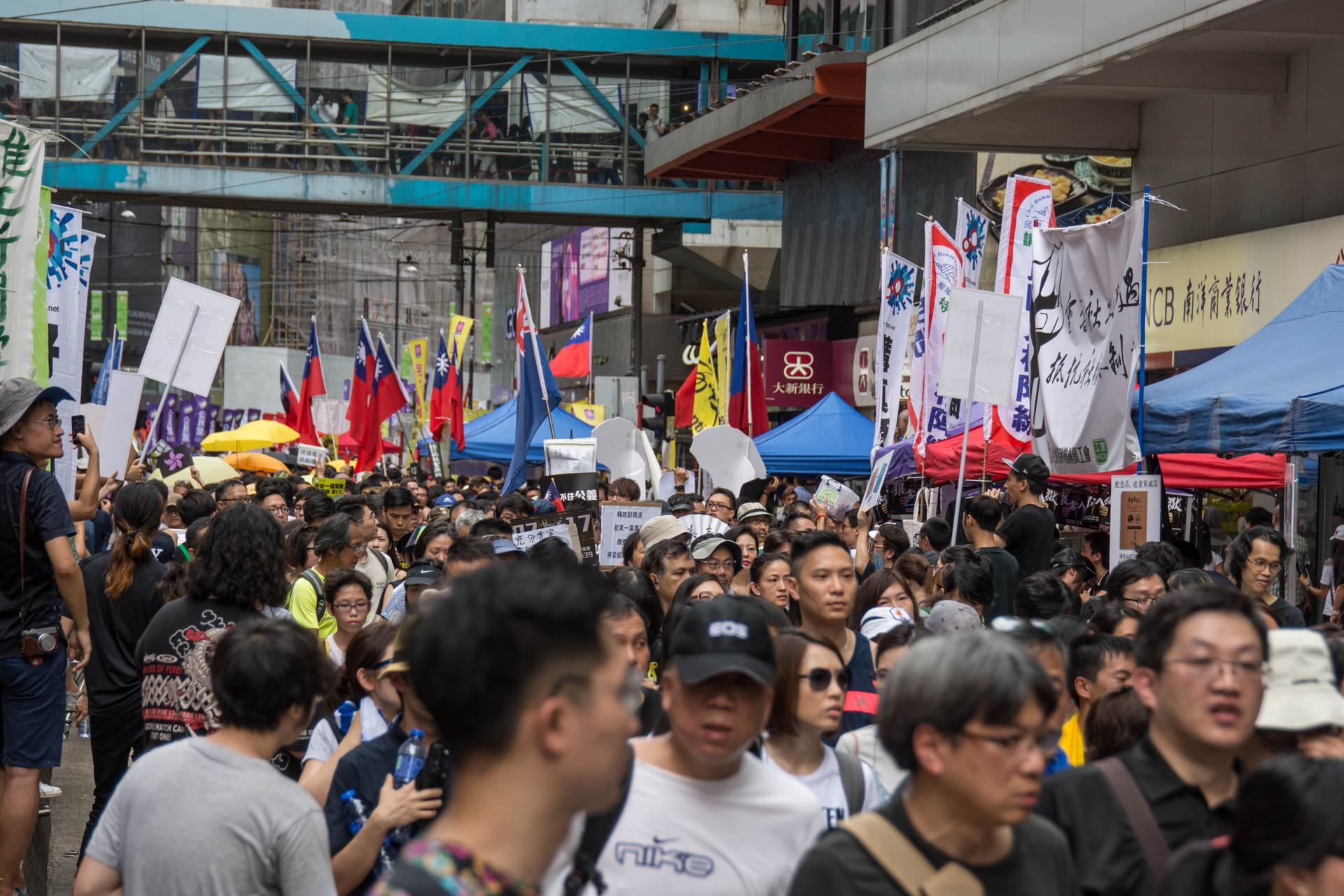 Marchers carried signs and banners championing their causes; beyond the annual call for universal suffrage, posters and stickers demanding the unconditional release of Nobel laureate and Chinese dissident Liu Xiaobo also proved popular.