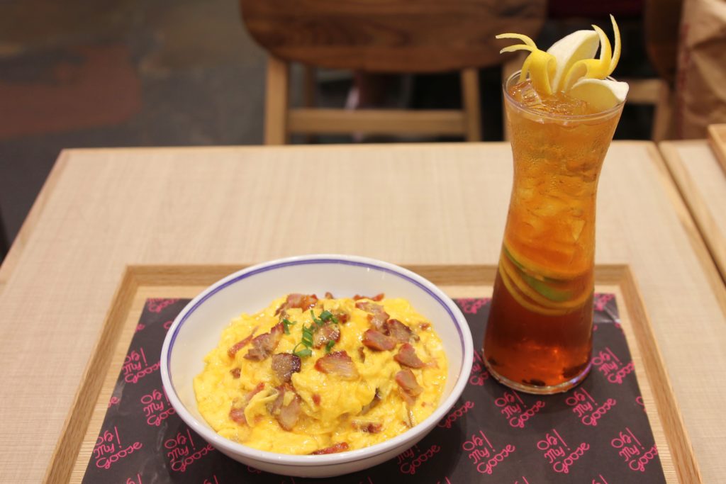 For those who like their egg yolks runny and meat chunks… chunky, then there’s also a BBQ pork and fried egg on rice served with Hainanese soy sauce (HK$52), pictured above in top photo. Oh My Goose! says this dish is meant to pay homage to the classic Stephen Chow movie God of Cookery, in which the BBQ pork and egg rice bowl features prominently in the story line [Ed. Note: If you don’t get this reference, please watch the movie — it’s hilarious].