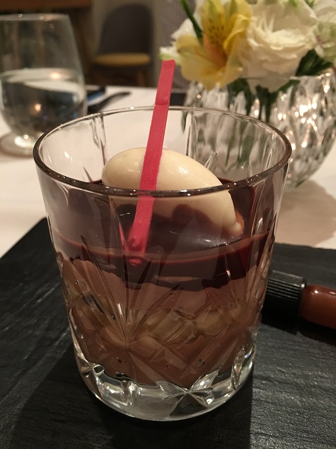 At this point in the meal, I came to better appreciate those first two light and delicate courses that stimulated the senses but didn’t overwhelm the palate. I was thankful for the room that remained in my belly as the sixth course, a dessert of Whisky Chocolate Banana, was the highlight along with the terrine. The dessert consisted of whisky ice cream, smoked chocolate mousse, dacquoise, whisky-infused banana and warm chocolate sauce, stuffed in a glass tumbler and placed on a black slate, next to a test tube filled with more chocolate. It was a fabulously sinful concoction.