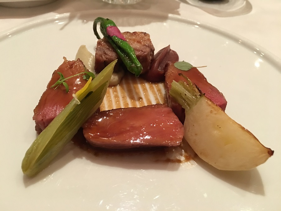 The fifth course was a main of Iberico Pork, which included four thick slices of pork organised in the shape of a trapezoid accompanied by fennel and flavoured with red date port wine, tamarind pineapple jalapeño paste and pork jus. In contrast to the langoustine, here the flavours blended well as the rich wine sauce was perfectly balanced with a touch of fruit and a hint of spiciness from the jalapeño, none of which masked the natural richness and woody flavour of the pork.
