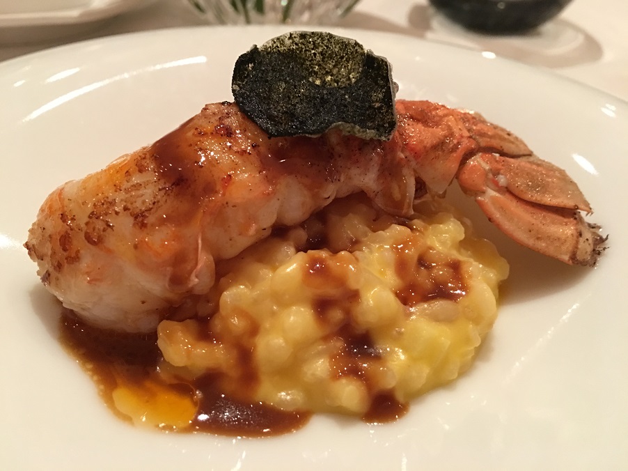 The fourth course and last of the “starters” was the Langoustine, which was served whole but for the head, and perfectly cooked just tender on top of a robust, sweet and sour mixture of mandarin apple rice, curry oil, basil pine nut mascarpone and kumquat confit. The quality of all of these ingredients was superb but I would have preferred a more savoury accompaniment to the subtle flavour and perfect texture of the langoustine, rather than the bold and somewhat too sweet accompaniment that was served.