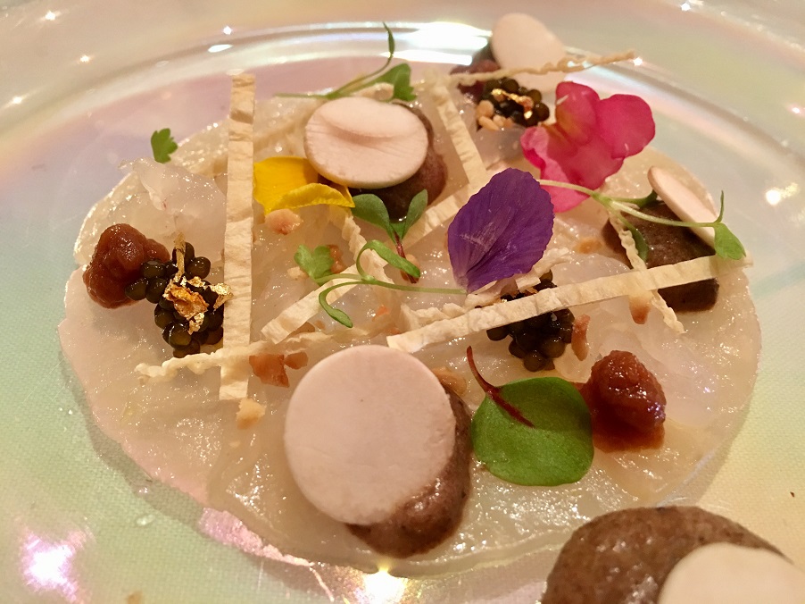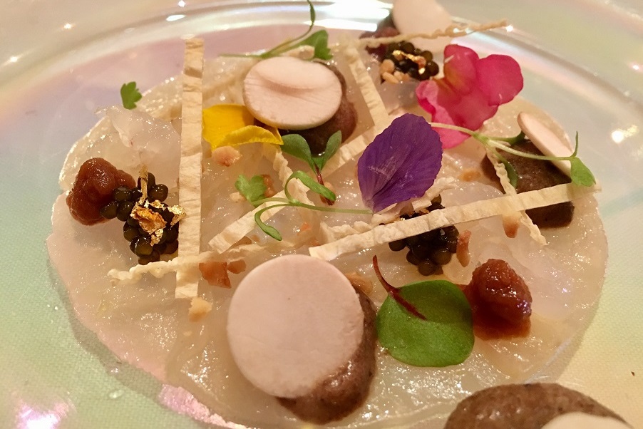 The second course of Scallop consisted of a thinly sliced Hokkaido scallop ceviche arrayed in a circle on the plate topped with an artfully decorated mixture of miso gel, sliced black garlic daikon radish, a small serving of caviar and more edible leaves and flower petals. This course was better balanced allowing the flavour of the cured scallop to come through without being masked by something as strong as the papaya salad in the first course. Nonetheless, at this point, I was still more impressed with the lovely presentation than the food itself.