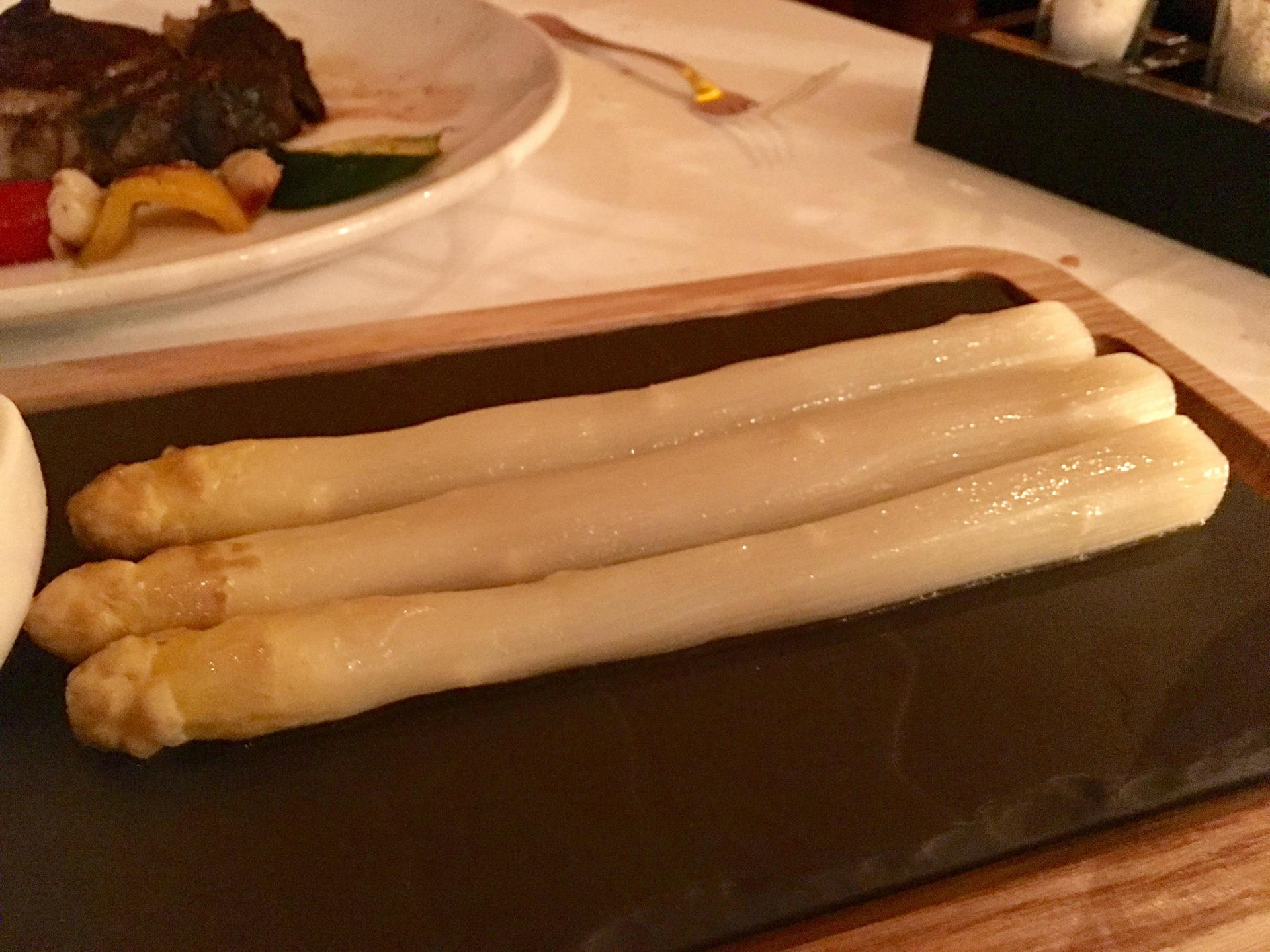We tried the seasonal special white asparagus with black truffle hollandaise (HKD280). White asparagus season is a major event in Germany from its commencement in April, when the first spears are hand-picked from the earth, to its conclusion in late June. The white asparagus at The Steakhouse were of the highest grade, thick and gently steamed to a silky texture with a much subtler taste than more pungent green asparagus. My only quibble with the dish was the choice to serve the soft spears on a trendy piece of slate so that the cutting process was literally reminiscent of fingernails on a chalkboard. Nobody wants that.