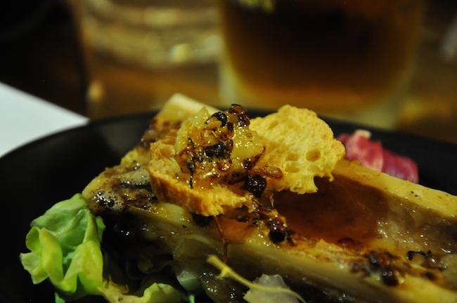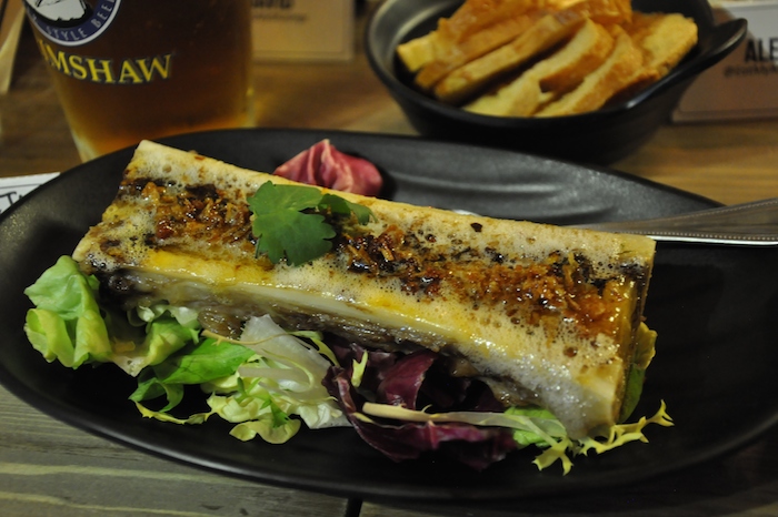 After a quick look around the space and a big swig of Brothers Toffee Apple Cider (HKD78, a bottle, not a swig), we got cracking on our first dish, the Numbing Bone Marrow (HKD108) – broiled bone marrow with Sichuan pepper-infused butter, garlic and herbs, served with tiny pieces of toast.