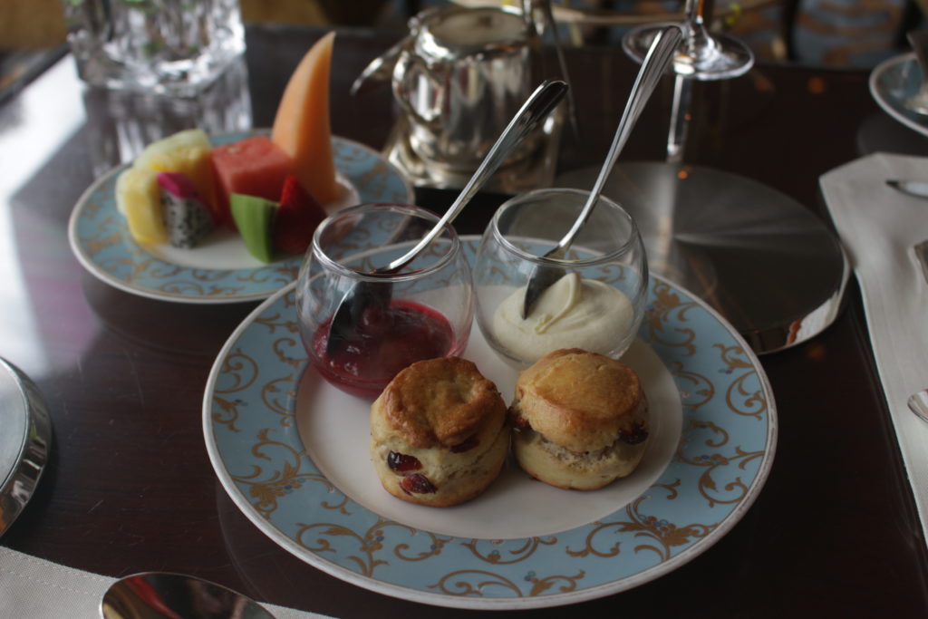And of course, it’s not afternoon tea without scones, and the cute bite-sized ones served at the Shangri-La come with a bowl of homemade jam made with raspberry, sakura and champagne and a bowl of clotted cream. The jam had the perfect amount of sharpness and was balanced out by the light fluffiness of the cream, and the scone itself — in part because of its size — wasn’t too heavy.