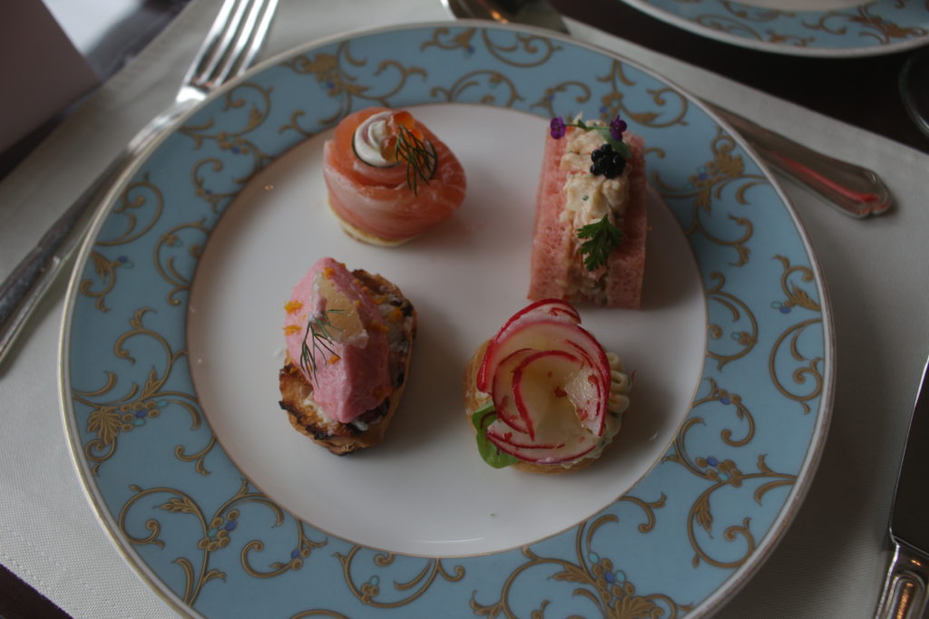 Moving on to the savory platter: Balik-style salmon on blini with salmon roe, crunchy baby radish with butter and pink peppercorn, and a lobster salad sandwich on beet bread.