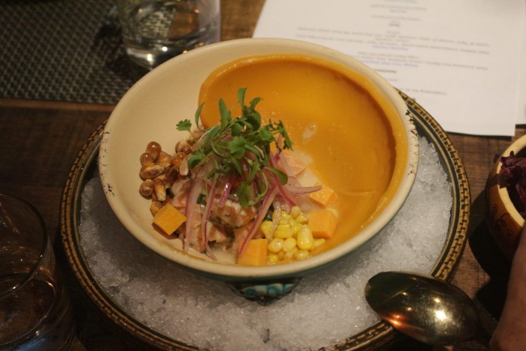 The chunks of sea bass have been cured with a “Leche de Tigre” (Tiger’s milk), a citrus-based marinade made up of celery, coriander, garlic, chili, lime sauce, fish stock, ginger, and white onions. The marinade has a nice kick and the extra crunch from the corn adds a nice bit of texture to the dish (go easy on that sweet potato pureé though).