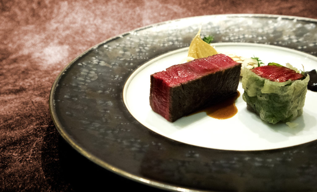 Courses: Snow crab and Hokkaido uni wrapped in a delicate ravioli made from Shogoinkabura, a Japanese turnip from Kyoto; Sanriku oysters wrapped in crisp kadaif pastry and served on a pillow of pumpkin and coriander espuma; homemade tagliolini with Australian black lipped abalone; Sanshou peppers, served with pan-seared foie gras and Japanese bamboo; poached blue lobster served with mixed Japanese mushrooms and barigoule (signature dish); and followed by a choice of roasted duck breast or charcoal grilled Japanese Wagyu beef tenderloin prepared two ways (signature dish)