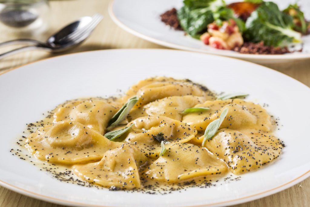 Pasta: Tagliatelle with porcini mushrooms and saffron; and mascarpone cheese ravioli in sage sauce