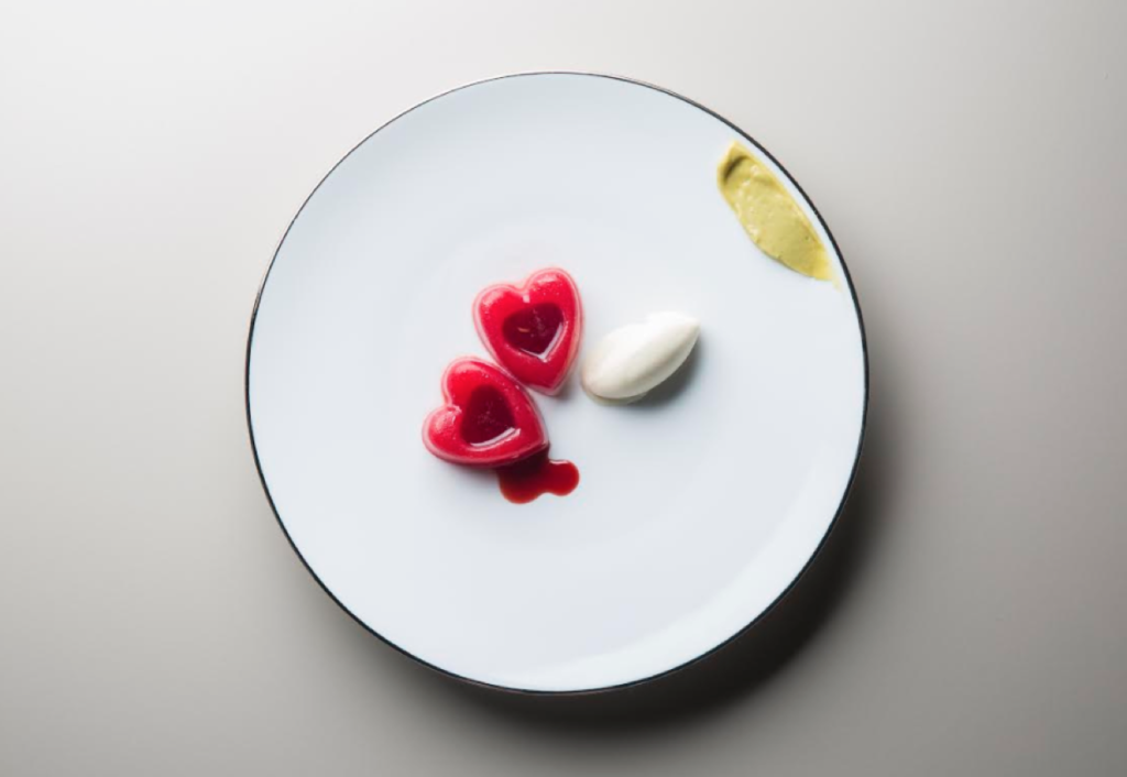 Dessert: Le Couer, a heart-shaped dessert made of vanilla and white chocolate mousse, raspberry, yuzu and almond sponge