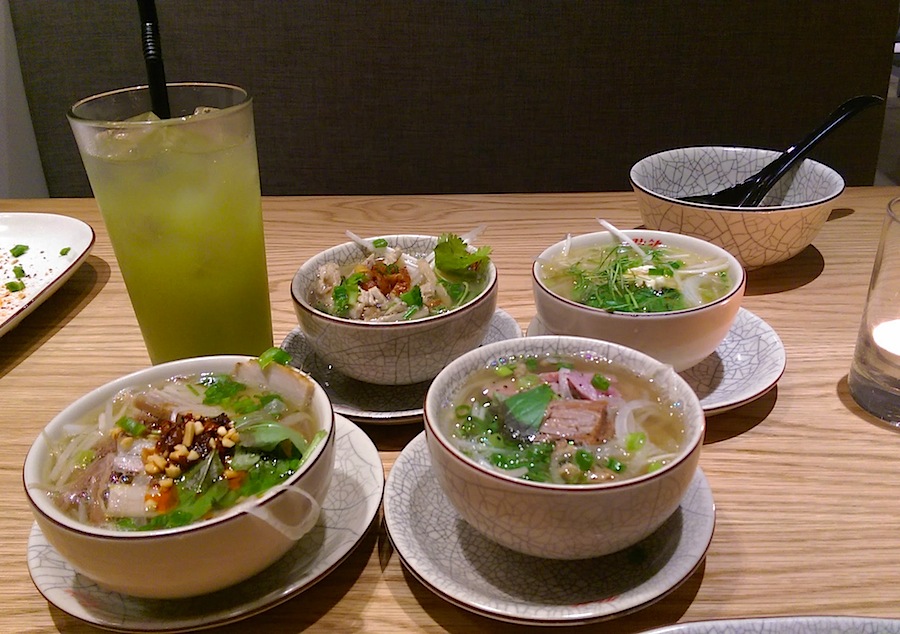 The chicken with the chicken-base soup was the freshest tasting; the succulent duck had infused much of its gamey flavour into the broth so needed more basil and coriander to cut through the richness; the beef was very good with slices of sirloin and a sweet, clear soup; the pork belly pho was the only one with a spicy kick.