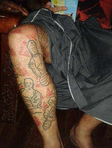The day he arrived in the Buddhist country someone snapped a picture of Polley’s tattoos, which depict Buddha repeatedly on his leg. The photo evidently went viral in Myanmar, reports CBC. Polley, 39, is a Mahayana Buddhist and says that the tattoos chart the development of Buddhism and its location on his leg symbolizes a pillar of support.
