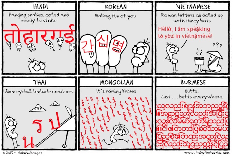 Check out this hilarious piece for the linguistically challenged from travel and language webcomic Itchy Comic by Malachi Ray Rempen.