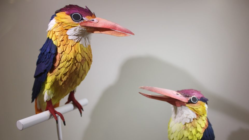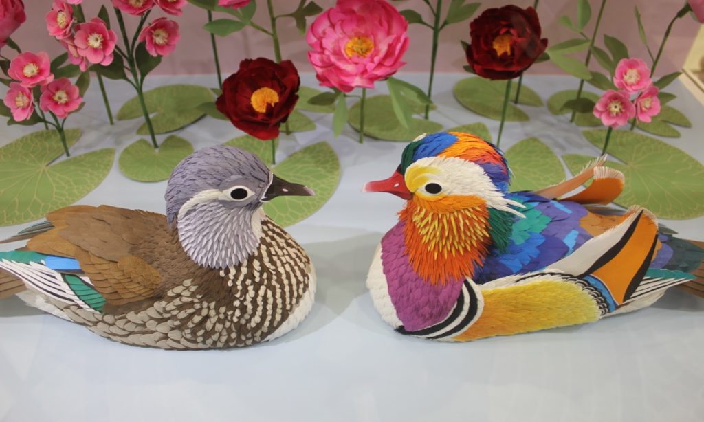 Like a birdwatcher, she’s slowly ticking off more species. From popular favorites like the kingfisher and the macaw, to flamingos and ducks, each is the result of a delicate process of gluing together numerous small pieces with liquid silicon. The mandarin ducks (pictured below) have 4000 individual paper feathers each.