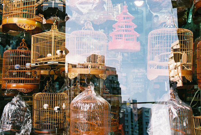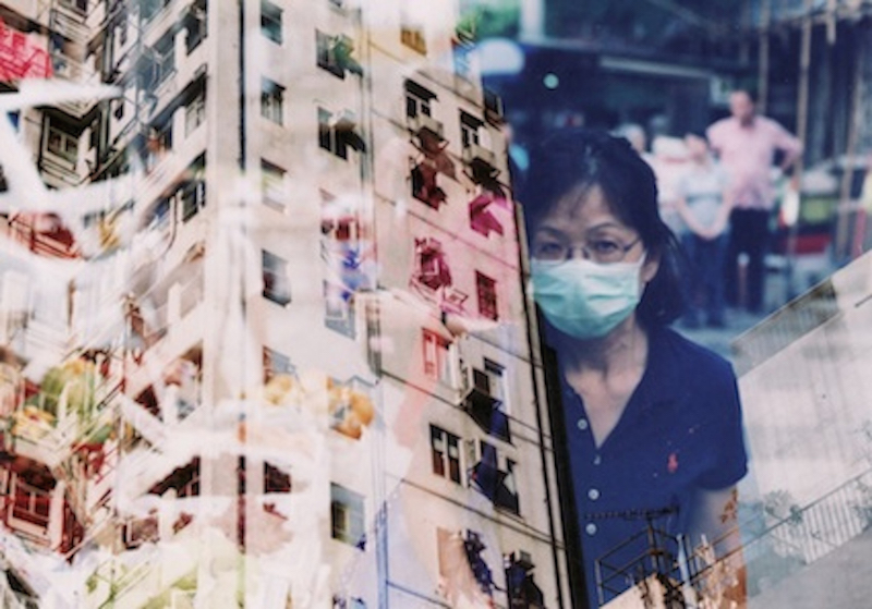 You’ll see traditional birdcages superimposed onto apartment blocks, or a woman wearing a surgical mask in the same frame as the face of a building peppered with air conditioning units.