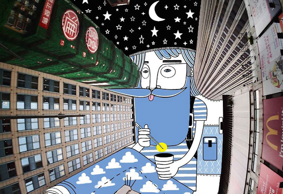 Since 2011, the creative Frenchman has been taking photos of the sky in urban neighborhoods around the world, and then drawing on the blank spaces between the structures.