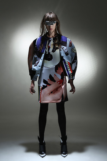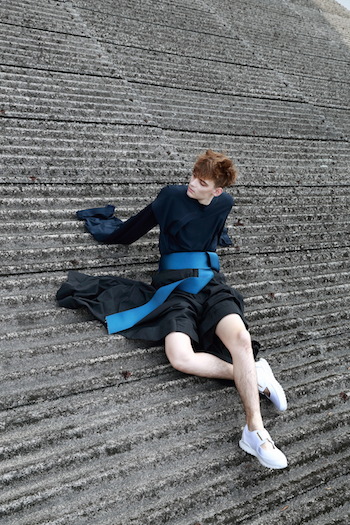 Representing menswear, Tsang offers up a samurai street look for a guy that might just take to the air like a ninja. It’s all about looking hood and swag these days, so this tunic – detailed with a backpack strap belt, paired with wide-leg pants and white kicks – ticks off all the boxes for today’s style conscious fashionisto.