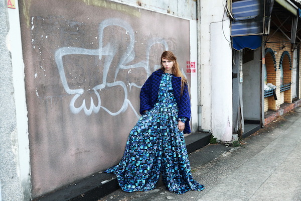 Tong likes to play with structure, sculpture and graphic prints. There is definitely a contemporary vibe emitting from this collection with the clear juxtaposition of hard and soft elements. The blue coat, which took three weeks to weave together, provides a fully detailed and hefty pairing to the flowing dress for an elegant, boho-chic look.