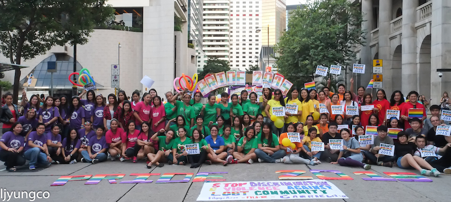 The small but colourful Sunday rally was organised by the Filipino Lesbians Organisation (FILO), the Filguys-Gabriela Association and Gabriela Hong Kong.