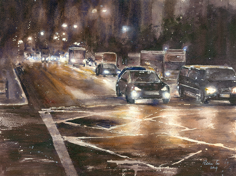Her watercolours depict the beauty of the city in a way that only a true local can. She transforms a mundane car ride – one familiar to hundreds of commuters – into a larger-than-life, dreamy scene, where car lights and sunlight mingle to create beautiful, vibrant colours.