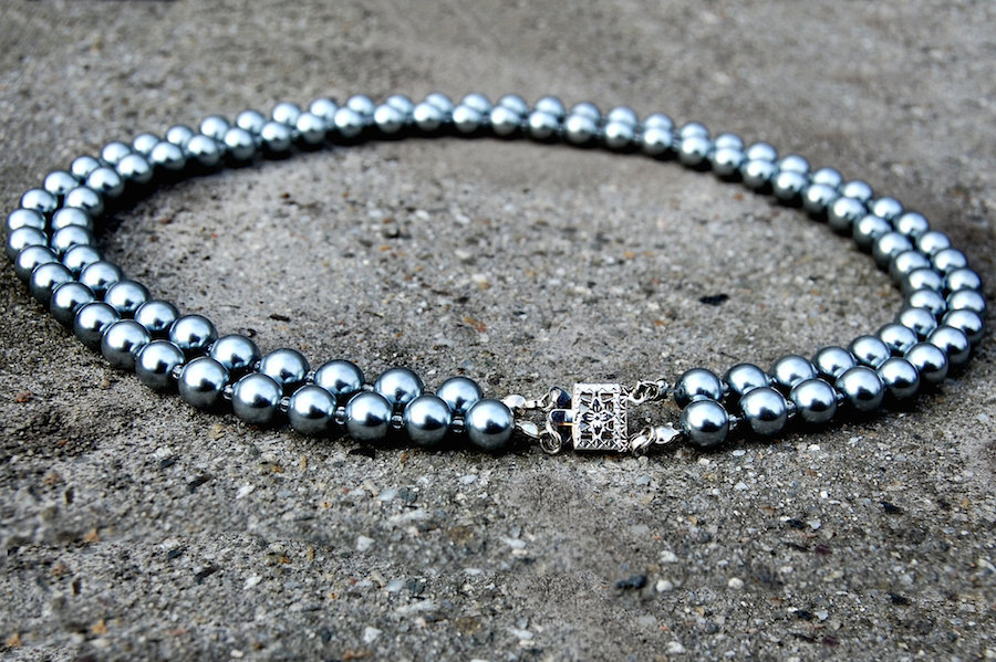 The necklace comprises 42 natural grey saltwater pearls and was mounted by Cartier. It also comes with a pair of natural grey pearl earrings.