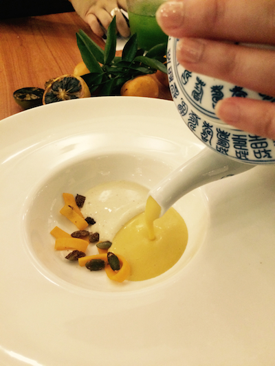 The dessert paid homage to the classic French Floating Island concept, but at the same time gave a nod to Chinese dessert soups with a toasted almond anglaise spiked with a punchy thyme meringue (acting as the island), plus bits of mangosteen and dragon fruit for freshness.