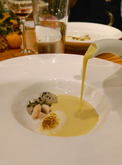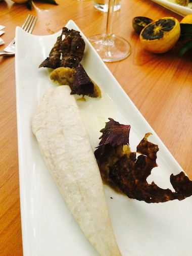 Next up, guests were presented with a Pompano fish fillet and a cream of lapsang souchong (a black tea), sunchoke ecrase (a sort of mashed artichoke), red shiso leaf and burnt citrus juice, which diners applied for themselves using charred lemons that doubled as table decoration.
