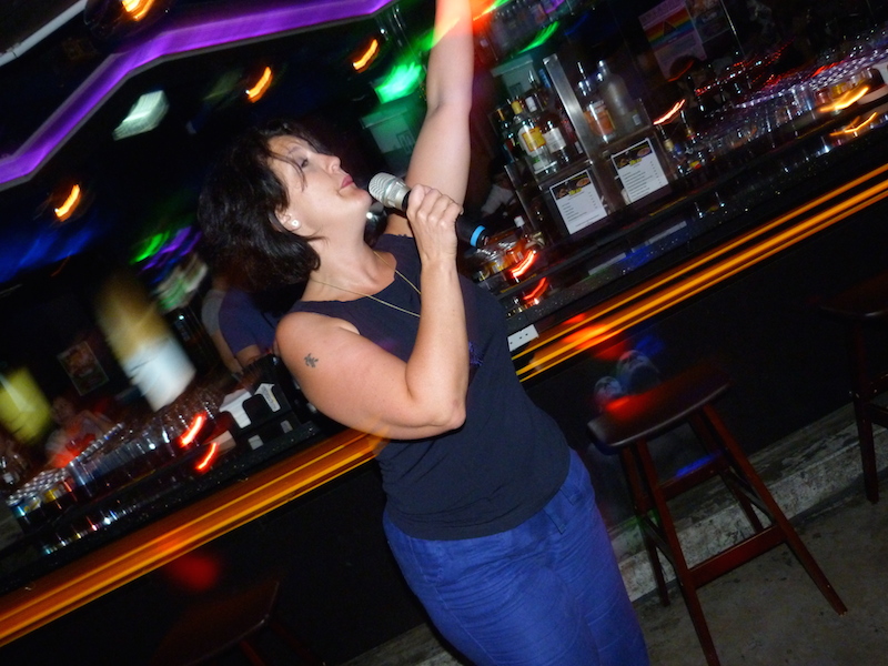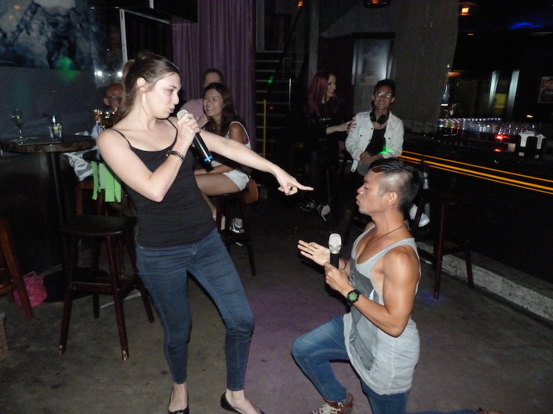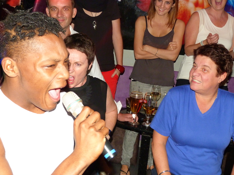 From this drunken table came our first two duellers, Nicky – who expertly showed us how it isn’t done with “Ain’t no Mountain High Enough” – and Jo, who unleashed some pole-grinding, bar-dancing sassmajazz via the vehicle of Aretha Franklin’s “R.E.S.P.E.C.T”.