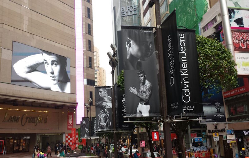 Justin Bieber’s face, body, and bulging tighty-whities are currently plastering every surface of the plaza in front of the mall.