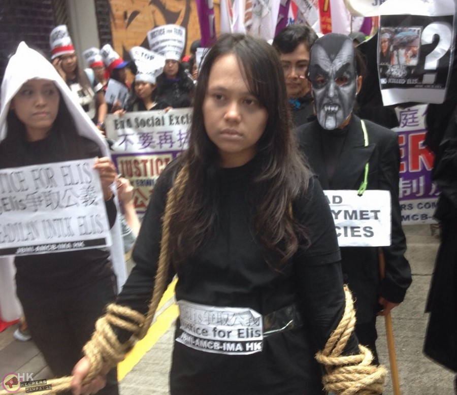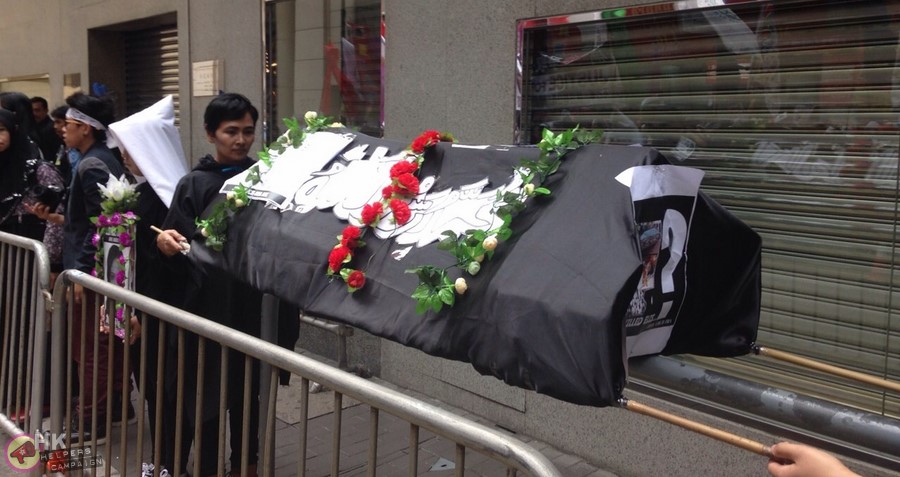 According to the Hong Kong Helpers Campaign, the crowd “wailed in sorrow” as a symbolic coffin representing Elis arrived to the protest.