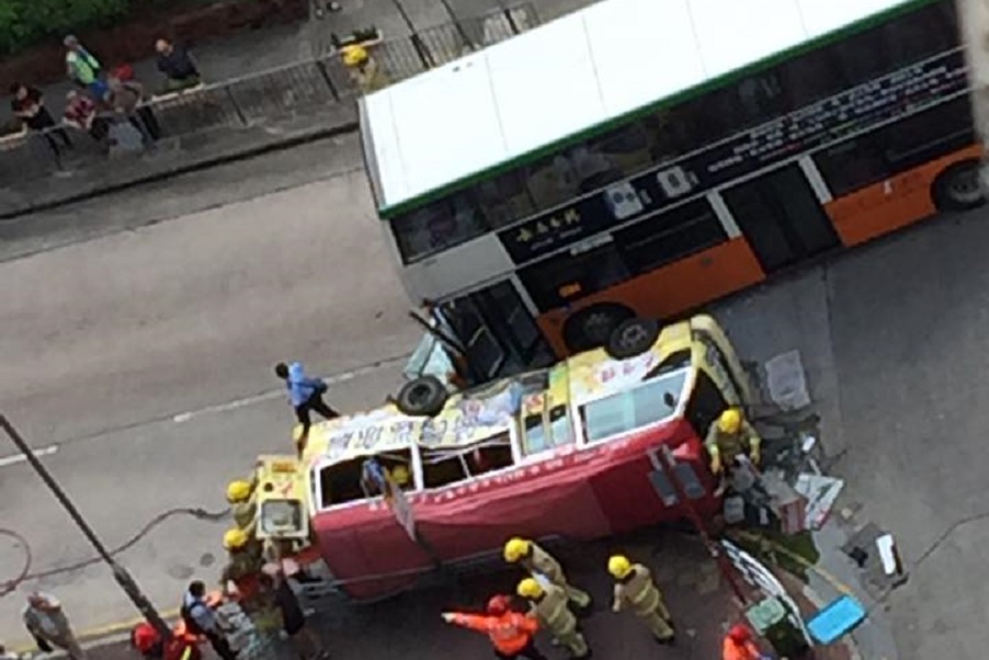 Two people are in critical condition and another 13 are injured after a red minibus and double-decker New World First Bus (NWFB) collided in Sham Shui Po this morning.