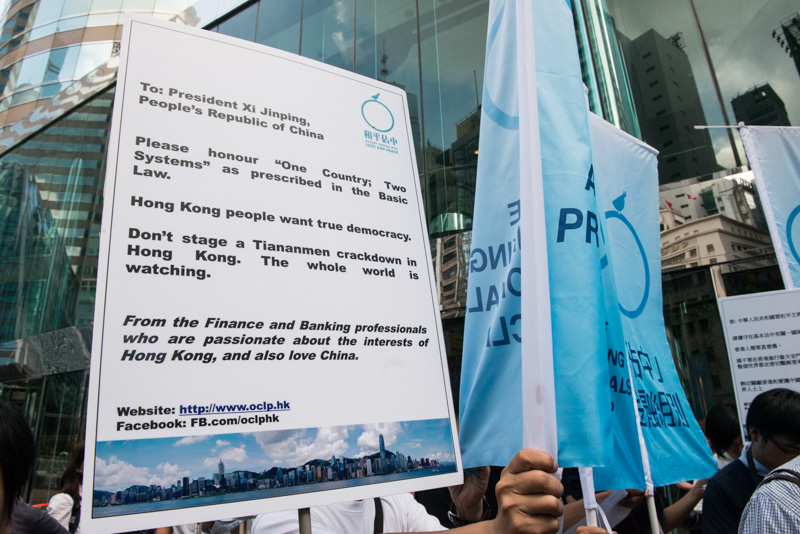 Yesterday a group of finance and banking professionals formed to support Occupy Central staged a demonstration at Exchange Square to announce the launch of an international media campaign. The aim is to increase international pressure on Beijing to give Hong Kong pro-democracy activists what they want, namely the ability to elect the chief executive in 2017 in accordance to international democratic standards.