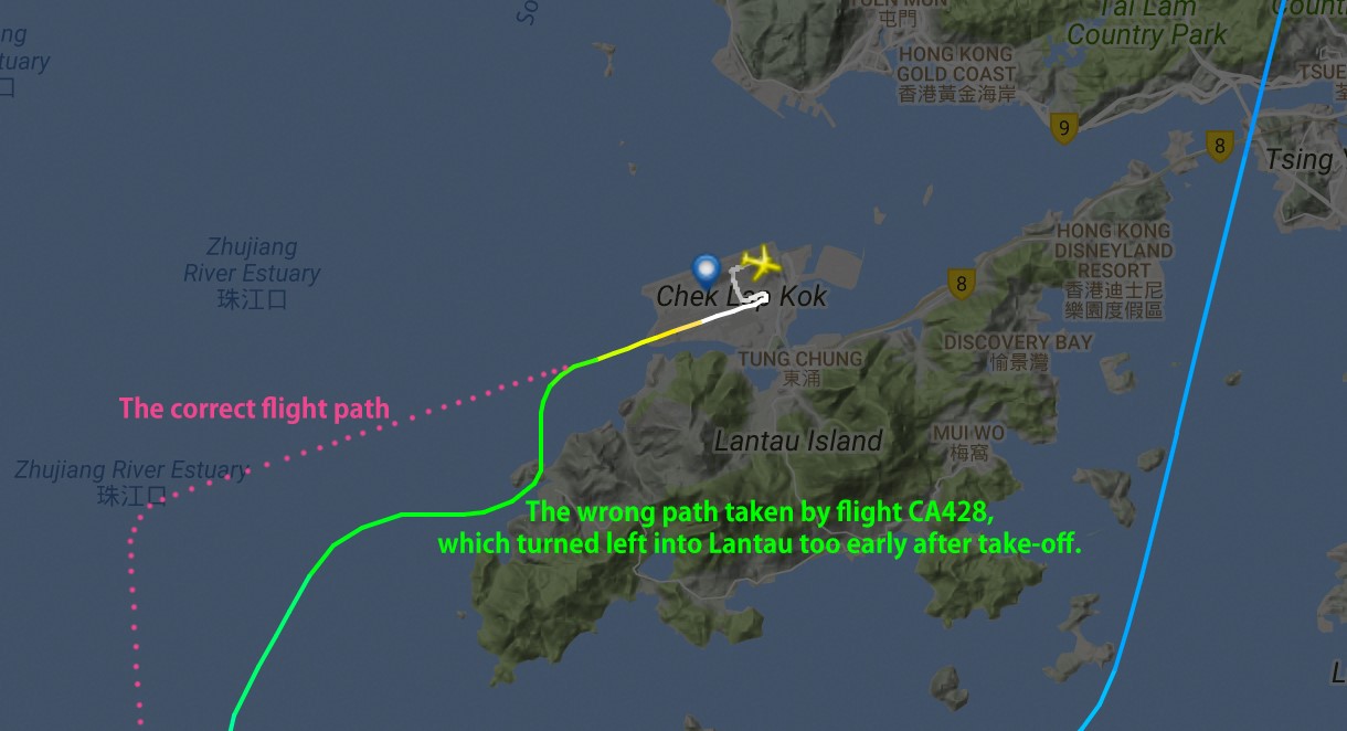 According to Civil Aviation Department (CAD), aircrafts making the same journey as Flight CA428 should fly straight ahead upon leaving the airport and only make a left turn midway into the Pearl River Estuary, roughly 7 nautical miles from the runway.