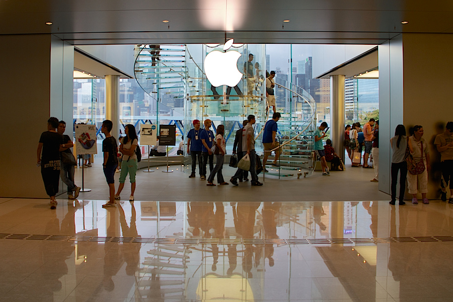 Around 10 protesters gathered outside one of Apple’s largest stores in Hong Kong this morning, holding giant phones with the slogan “Throw Away The Bad Apple”.