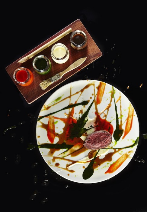 Does this dish remind you of the works of American abstract painter Jackson Pollock? Paint, a beef dish with little jars of spinach, potato, pepper and truffle jus