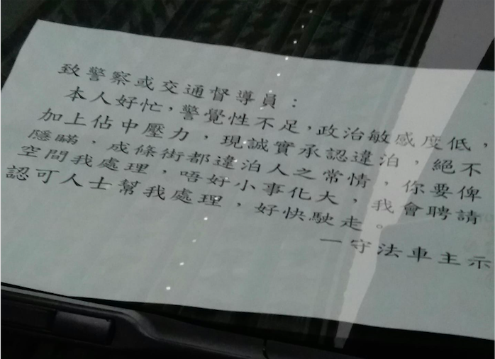 It reads: “Dear officer, I’m very busy, insufficiently aware, have low political sensitivity, pressured by Occupy Central, I admit to illegal parking, the whole street’s filled with illegally parked cars, give me space to sort it out and I will drive off.”