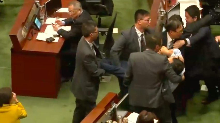 At one point Ted Hui from the Democratic Party can be seen being pushed to the ground by security as he tries to intervene.