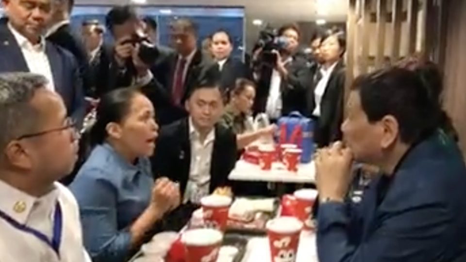 According to the SCMP, flanked by family members, aides and officers, Duterte showed up shortly before 6pm and invited a domestic helper dining there to chat over chicken.