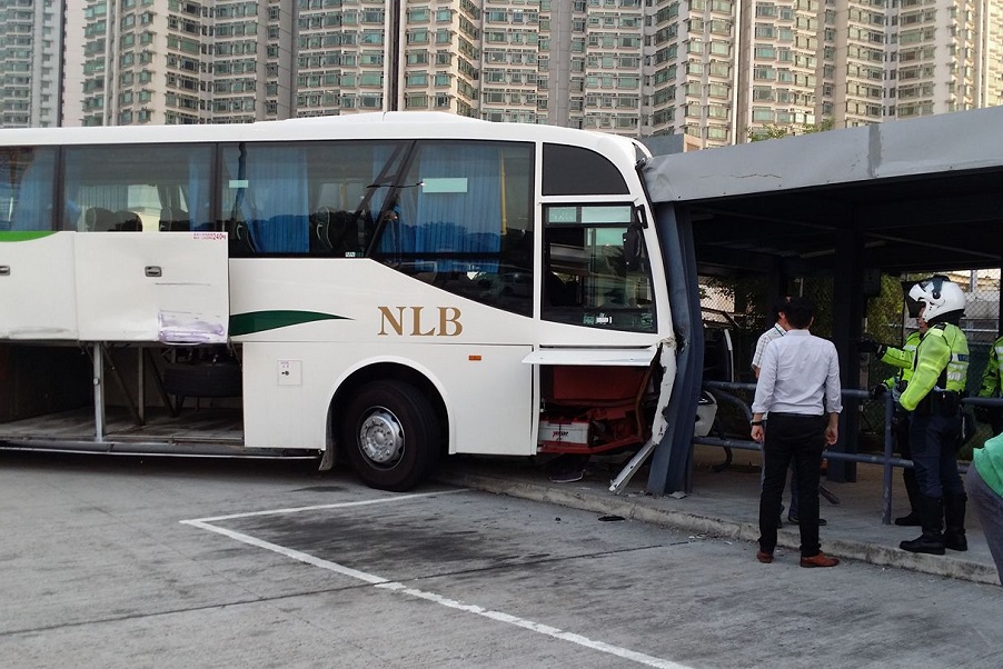 A New Lantao Bus (NLB) coach crashed into Tung Chung Bus Terminus this afternoon, briefly trapping the driver inside and reportedly causing injuries to a total of nine people.