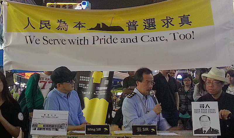 After performing a mock-police announcement under the banner, “We Serve with Pride and Care Too!” in Mong Kok last week – and as bailiffs move in today to clear the Admiralty protest site – Hong Kong legislator Fernando Cheung (AKA the “Long Hair of the social service sector”) spoke to Coconuts Hong Kong about the continued importance of the protests.