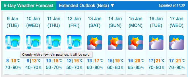 According to the nine-day weather forecast, the temperature tomorrow could be as low as eight degrees Celsius or as high as 10, and will continue to be cloudy with some rain.