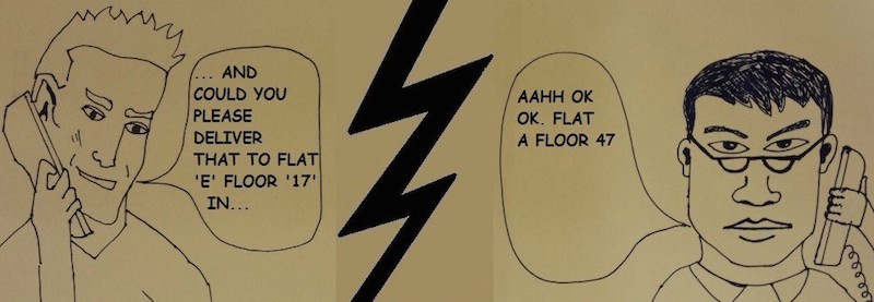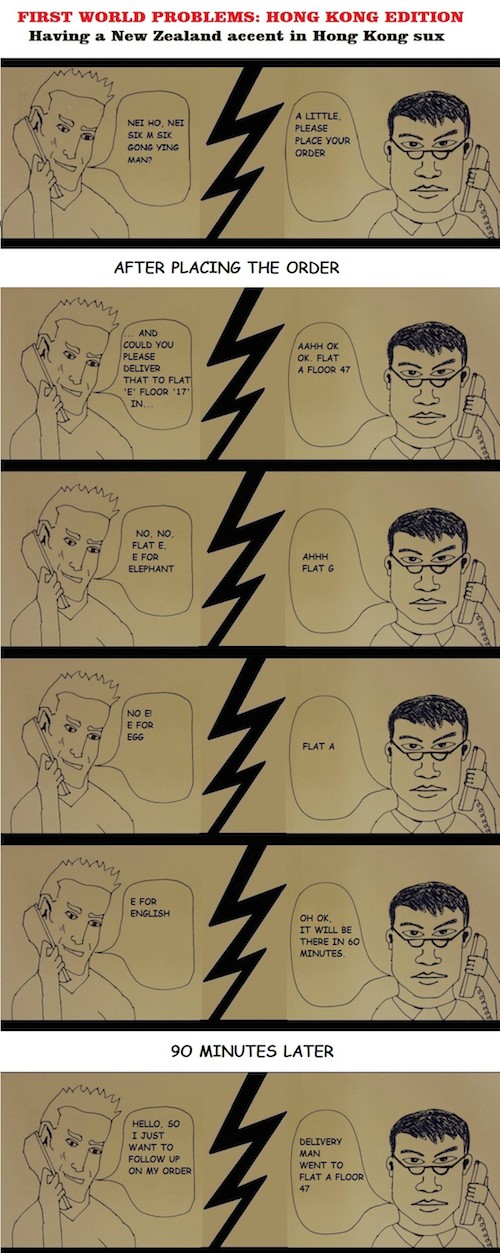 “First World Problems: Hong Kong Edition” depicts a rugged-looking New Zealander attempting to secure a delivery from a geeky-looking Hong Kong phone operator.