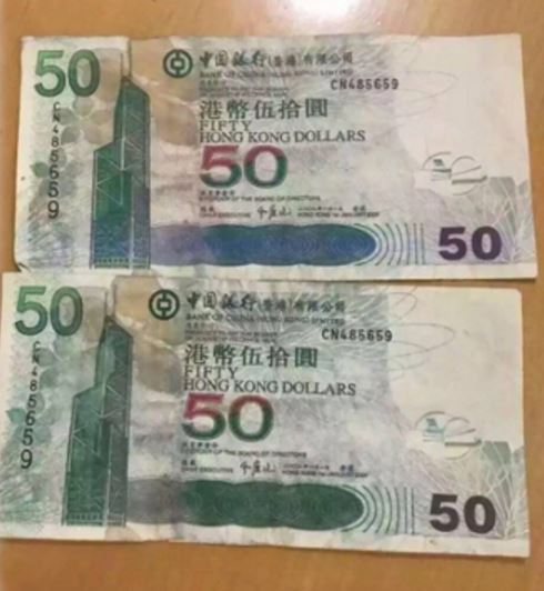 News of the dodgy HKD50 bills first surfaced when a picture of two notes with the exact same serial number (CN485659) and issue date (January 1, 2009) went viral.