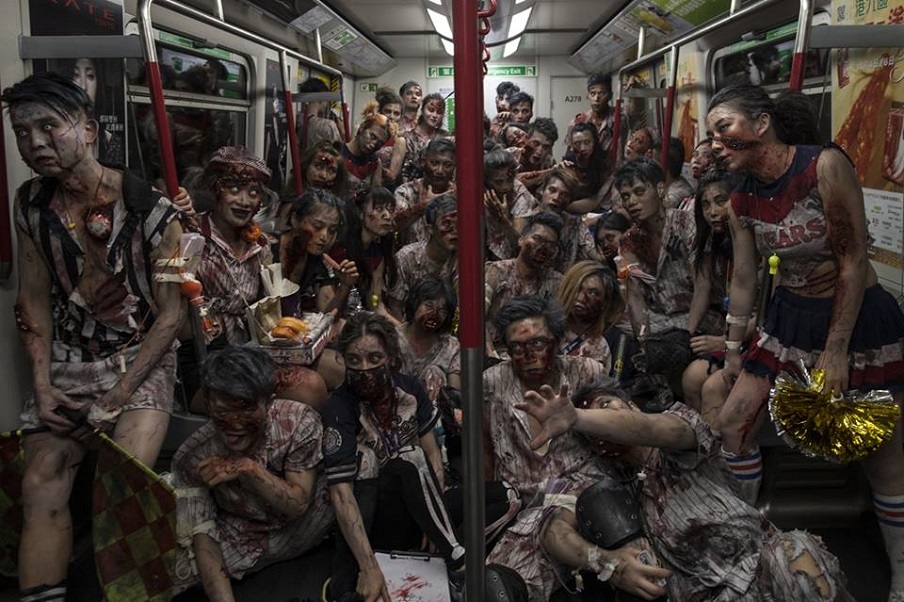 It comes as no surprise then, that local “zombie walks” drew so many Hongkongers. One photo in particular, picturing around 40 undead baseball players crammed into an MTR carriage, went viral yesterday: