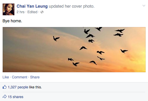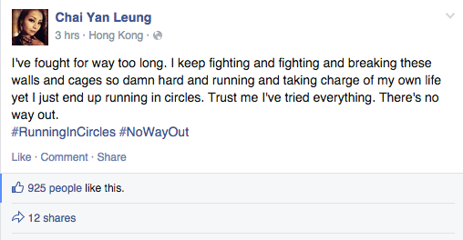 Chai Yan Leung, the daughter of Hong Kong’s Chief Executive CY Leung, has claimed on Facebook page that she is leaving home after being hit and kicked by her mother.