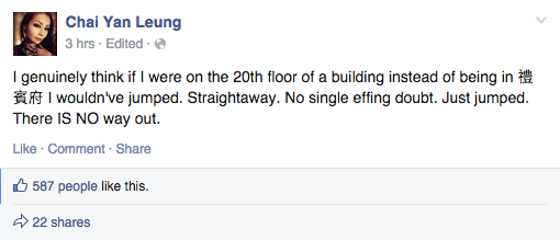 Chai also claimed, “I genuinely think if I were on the 20th floor of a building instead of being in 禮賓府 [Government House] I would’ve jumped. Straightaway. No single effing doubt. Just jumped. There IS NO way out.”