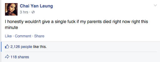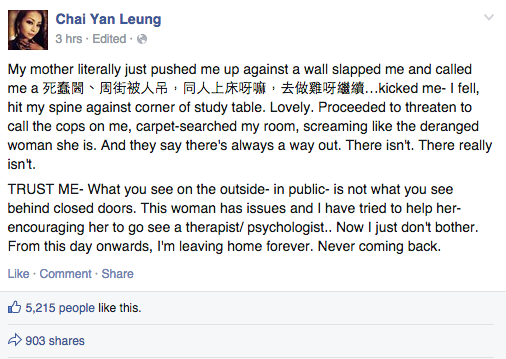 In a status update at around 7am this morning, Chai claims her mother, Regina Leung, slapped her and called her a “stupid f**king c*nt” and a “prostitute”, and accused her of sleeping around.