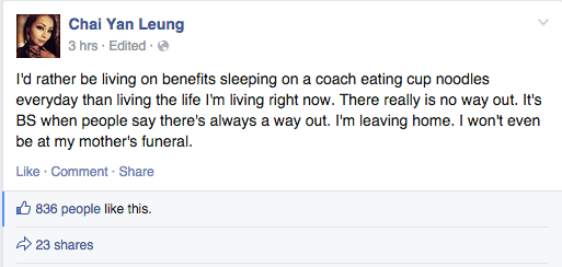 In various posts that followed, Chai said she’s leaving home forever, adding, “I’d rather be living on benefits sleeping on a coach (sic) eating cup noodles everyday”.