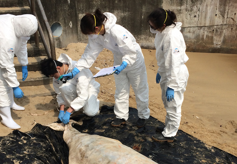 Yesterday, a team from the Ocean Park Conservation Foundation (OPCF) examined the carcass of a Chinese white dolphin found in waters near the Hong Kong airport.